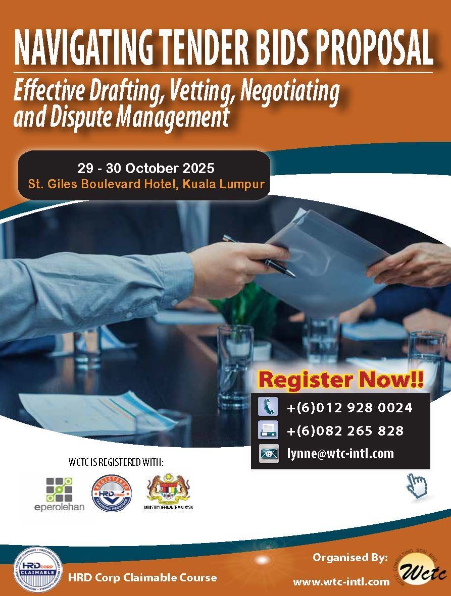 This comprehensive two-day training is designed specifically for professionals engaged in tendering, contract negotiation, and dispute management within the Malaysian business environment. Participants will gain a deep understanding of the entire tender lifecycle, from pre-tender stages to post-award procedures. The training will provide a detailed walk-through of pre-tender, tendering, and award stages, highlighting legal obligations, liabilities, risks, and implications. Attendees will receive practical insights into best practices, tools, and proven strategies for managing tenders and bids, including drafting and vetting procurement agreements, negotiating tender contracts and recognizing critical legal clauses.